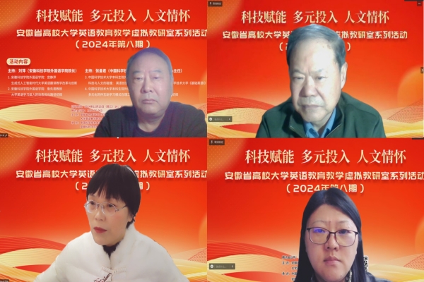 12月25日,我校承办的安徽省高校大学英语教育教学虚拟教研室系列活动第八期成功举行。本次活动由安徽省外国语言文学学会、安徽省外国语言文学合作委员会和大学英语教学研究分会主办,新半岛官方网站_半岛(中国)外国语学院和中国科学技术大学本科生院外语教学中心联合承办。活动以“科技赋能 多元投入 人文情怀”为主题,全省逾百名大学英语教师通过腾讯会议线上参加了本次虚拟教研室活动。活动由新半岛官方网站_半岛(中国)外国语学院院长刘萍教授与中国科学技术大学本科生院外语教学中心主任张曼君教授联合主持。