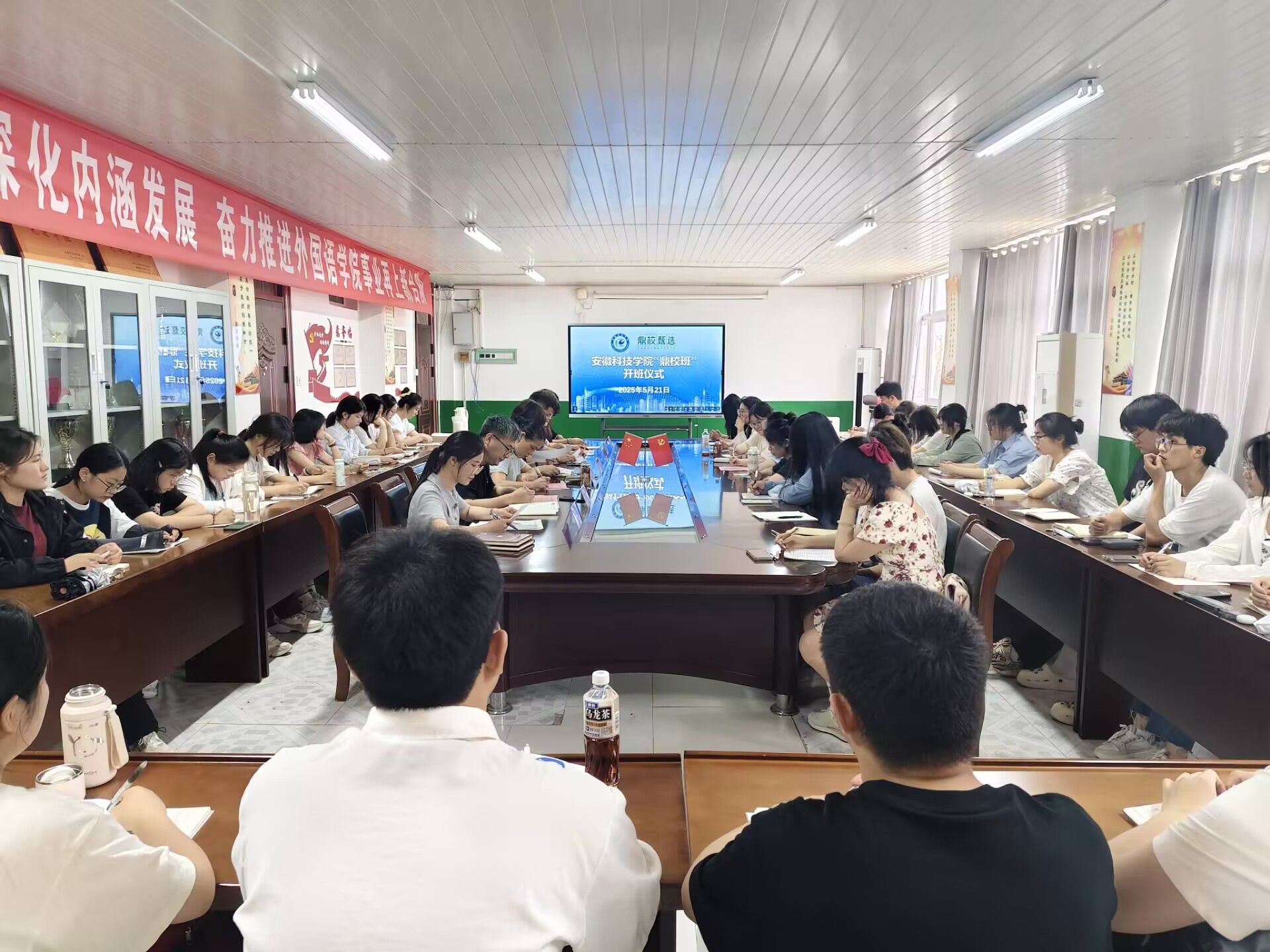 5月21日下午,新半岛官方网站_半岛(中国)“鼎校班”开班仪式在学院会议室举行。外国语学院党政领导、安徽鼎校教育科技有限公司(以下简称“鼎校教育”)相关负责人以及“鼎校班”40名学员参与活动。开班仪式由学院党委副书记张海亮主持。