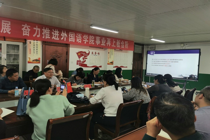2023年4月17日下午,外国语学院邀请南京大学陈新仁教授在学院会议室开展学术交流活动,陈教授为学院全体教师做了题为“外语教学研究的选题与论文写作”的学术讲座,外语教学与研究出版社经理王学松应邀列席。讲座由外国语学院院长刘萍主持,学院全体党政领导出席,所有下午无课教师认真聆听了学术讲座。