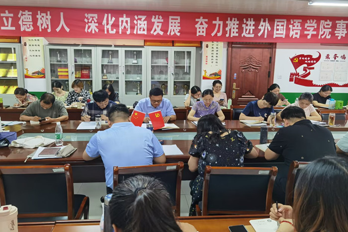 外国语学院党委书记蔡为青首先带领全体教职工集中学习习近平总书记在中央政治局第五次集中学习时的讲话,要求全体教师提高政治站位,加强思想政治学习;然后她再次强调了师德师风建设的重要性,要求每位老师务必完成师德学习教育,各教研室必须集中学习、研讨,同时她还部署了师德专项整治工作;最后要求各基层党组织暑期继续深入开展主题教育,以主题教育成果促进学院发展,同时提醒老师务必牢记意识形态和安全稳定工作的极端重要性。