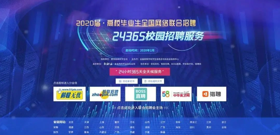 2月28日起,由教育部大学生就业网(新职业网)联合前程无忧、智联招聘、BOSS直聘、中华英才网、猎聘网五家社会招聘网站举办的“2020届高校毕业生全国联合网络招聘——24365校园招聘服务”活动正式推出。此次网络招聘抓紧关键环节,做好招应聘双方信息对称,将岗位信息输送至每位高校毕业生。