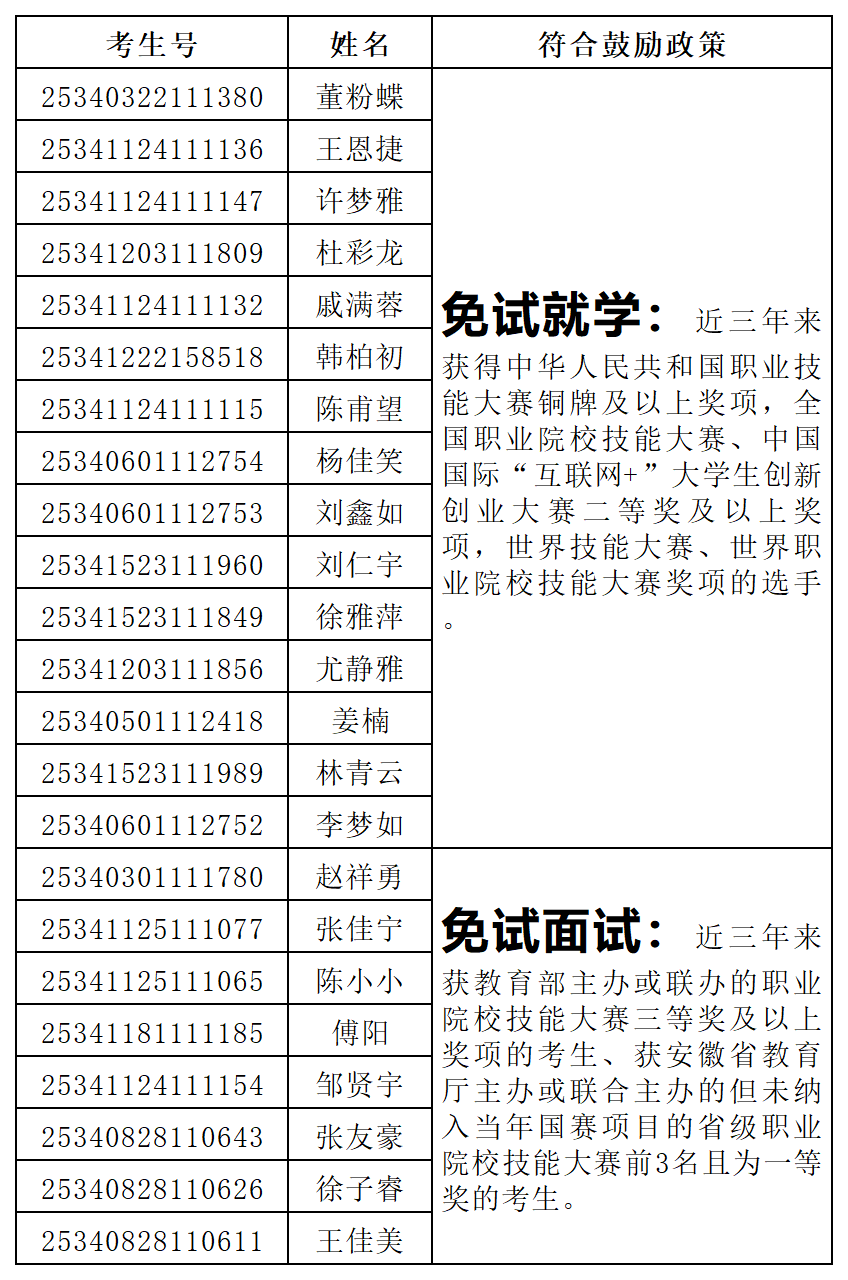 根据《新半岛官方网站_半岛(中国)2025年面向中职毕业生对口招生章程》关于申请免试就学、免试面试和加分鼓励政策的相关要求,经考生申请,学校审核,共有董粉蝶等15名考生符合免试就学政策,赵祥勇等8名考生符合技能大赛免试面试政策,无符合考试加分政策考生,现对符合相关鼓励政策的考生信息予以公布。免试就学资格复审和免试面试具体安排见招生与就业工作处网站“招生服务”栏“新半岛官方网站_半岛(中国)2025年对口招生考试免试就学资格复审和免试面试工作通知”。如有异议或遗漏,请于3月19日17:00前联系新半岛官方网站_半岛(中国)招生办公室:0550-6732041,0552-3197041。