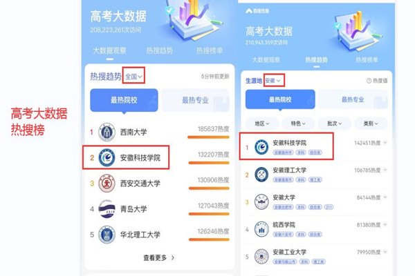 精心的招生宣传安排,立体化招生宣传方式,良好的新媒体宣传矩阵,成就了招生宣传的高热度。百度高考大数据显示,学校考生搜索热度在安徽省遥遥领先,一度跃居全国第二位,《中国青年报》两次报道学校招生工作。